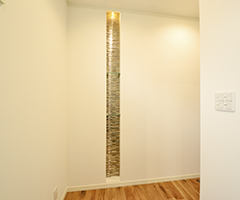 玄関部にはシンプルな縦長のニッチにタイルをあしらい、ガラス棚で仕上げました。