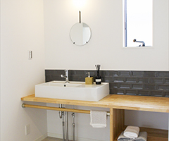 洗面にはグレーのブロックタイルを張ることで無骨なデザインを演出。