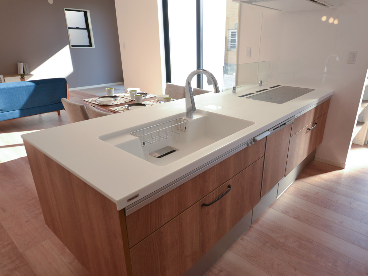 家族の顔が自然と見えるフラット対面プランの「オフェリア」キッチンは、開放感が魅力。段差のない広々としたカウンタートップは作業がしやすく、配膳もスムーズに行えます。木目調の扉が空間にやわらかな温もりを添え、LDK全体を美しく調和させます。大きな窓から光が差し込み、料理の時間がより心地よいひとときに。