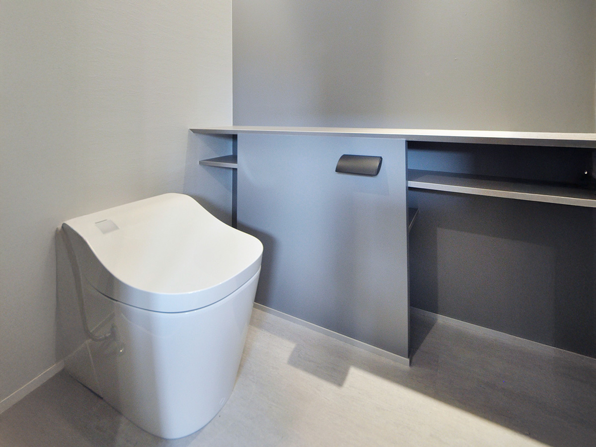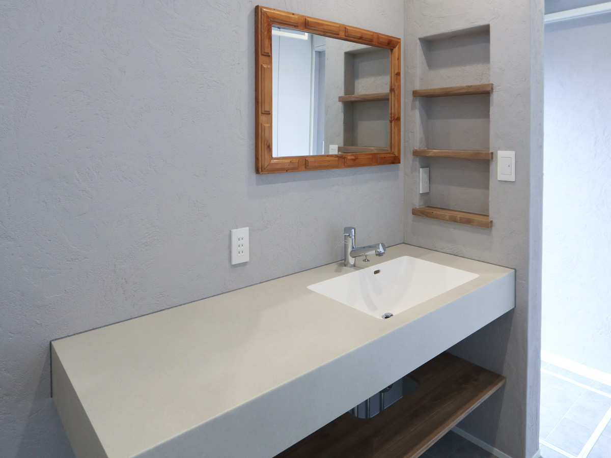 洗面室には、ゆったりとした広さのカウンターと、木のフレームが印象的なミラーを採用。壁面ニッチの収納棚は、スキンケア用品やタオルを美しく整理でき、使い勝手とデザイン性を両立しています。清潔感あふれる落ち着いた空間で、朝の支度も快適に。