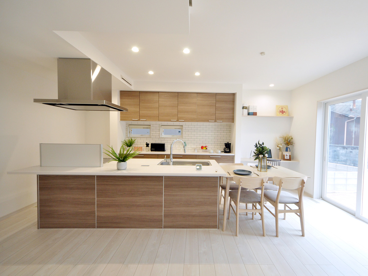 約19.4帖のLDKはアイランドキッチンが主役。家族が自然と集まり、にぎやかさも落ち着きも楽しめる空間になっています。