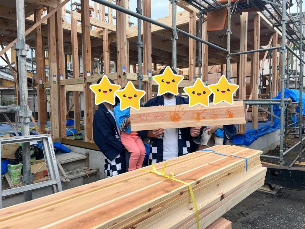 アットホームな雰囲気のなかご家族皆さんの手形を押していただき記念の棟木を実際施工していきます!