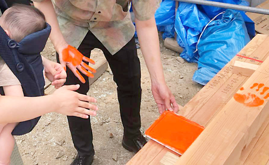 ご家族そろって棟木に手形を押し、家内安全を祈願しました。