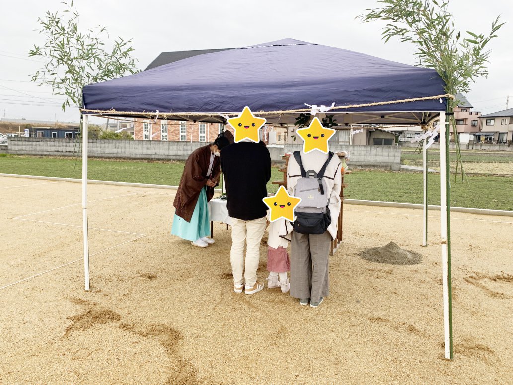 アットホームな雰囲気のなか、お天気にも恵まれ、ご家族皆さんで土地の神様に工事のご報告と安全祈願をいたしました。